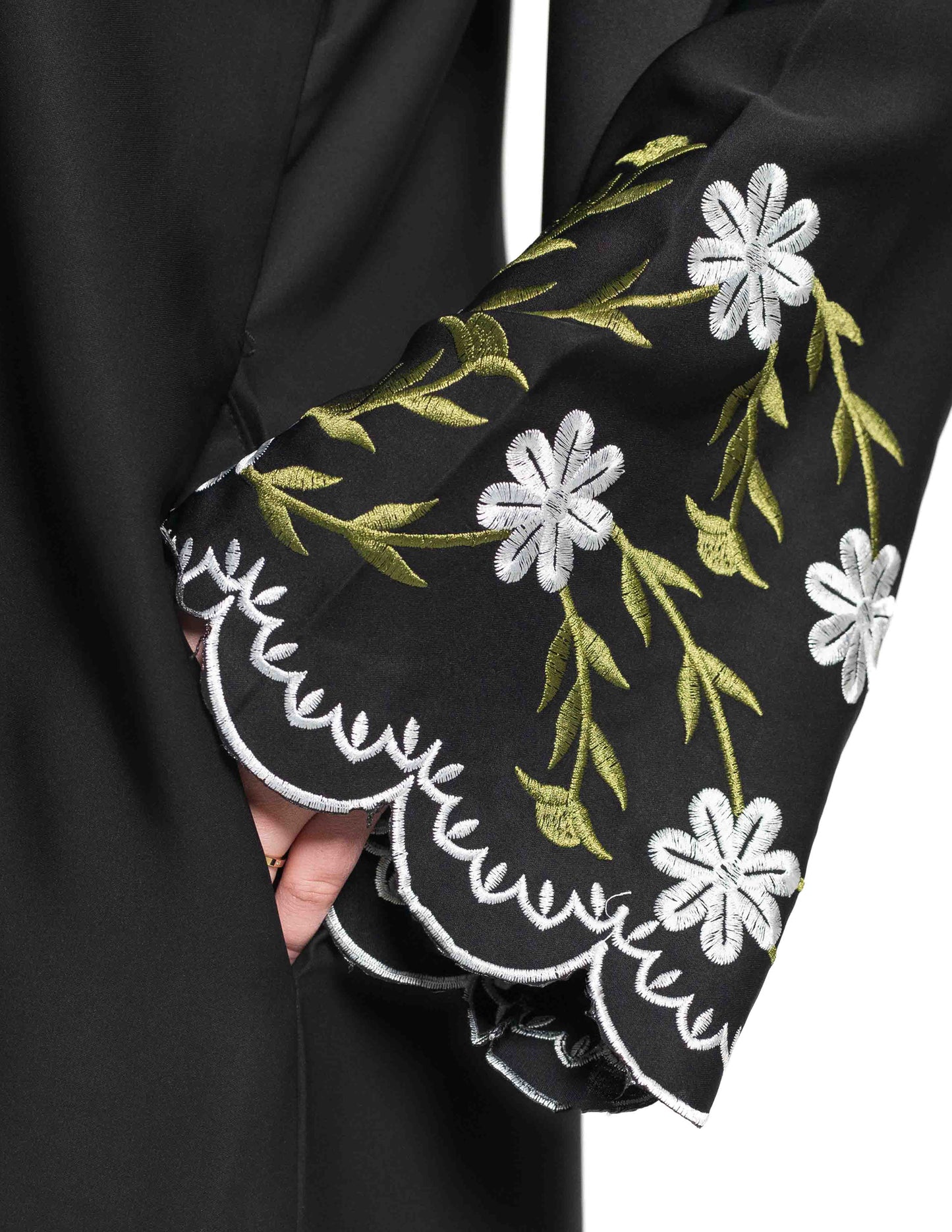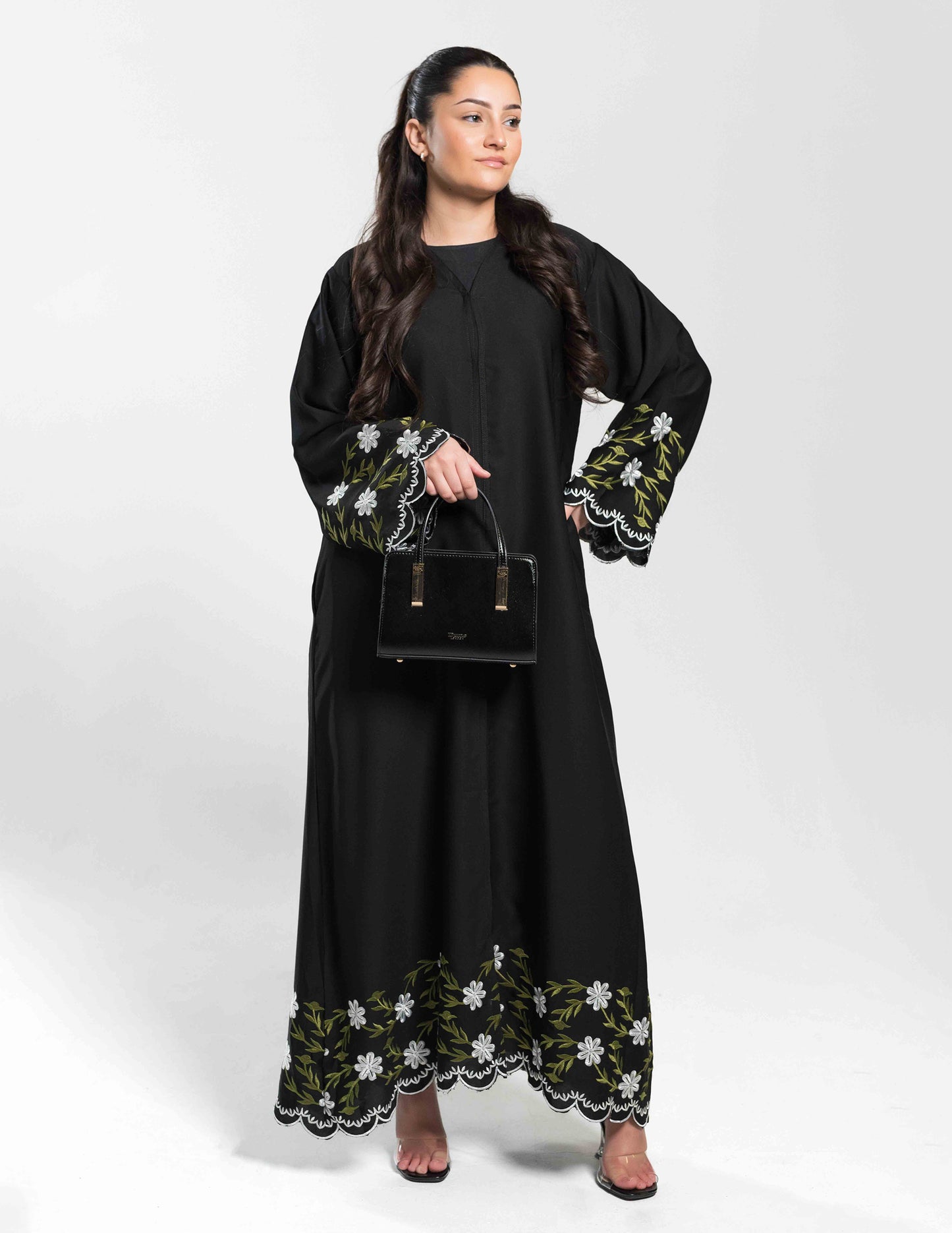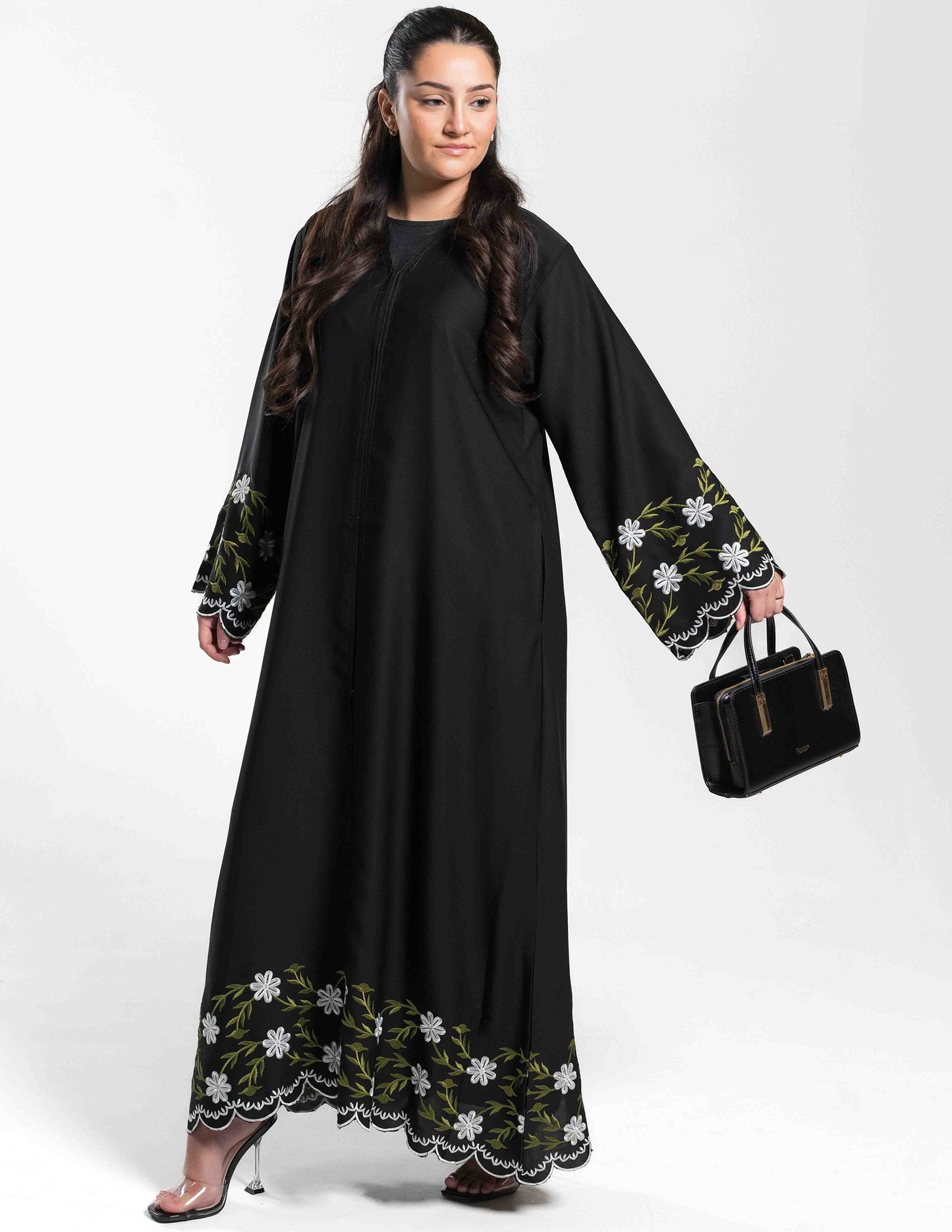 'Hadiqa' Black Open Abaya with Green Embroidery