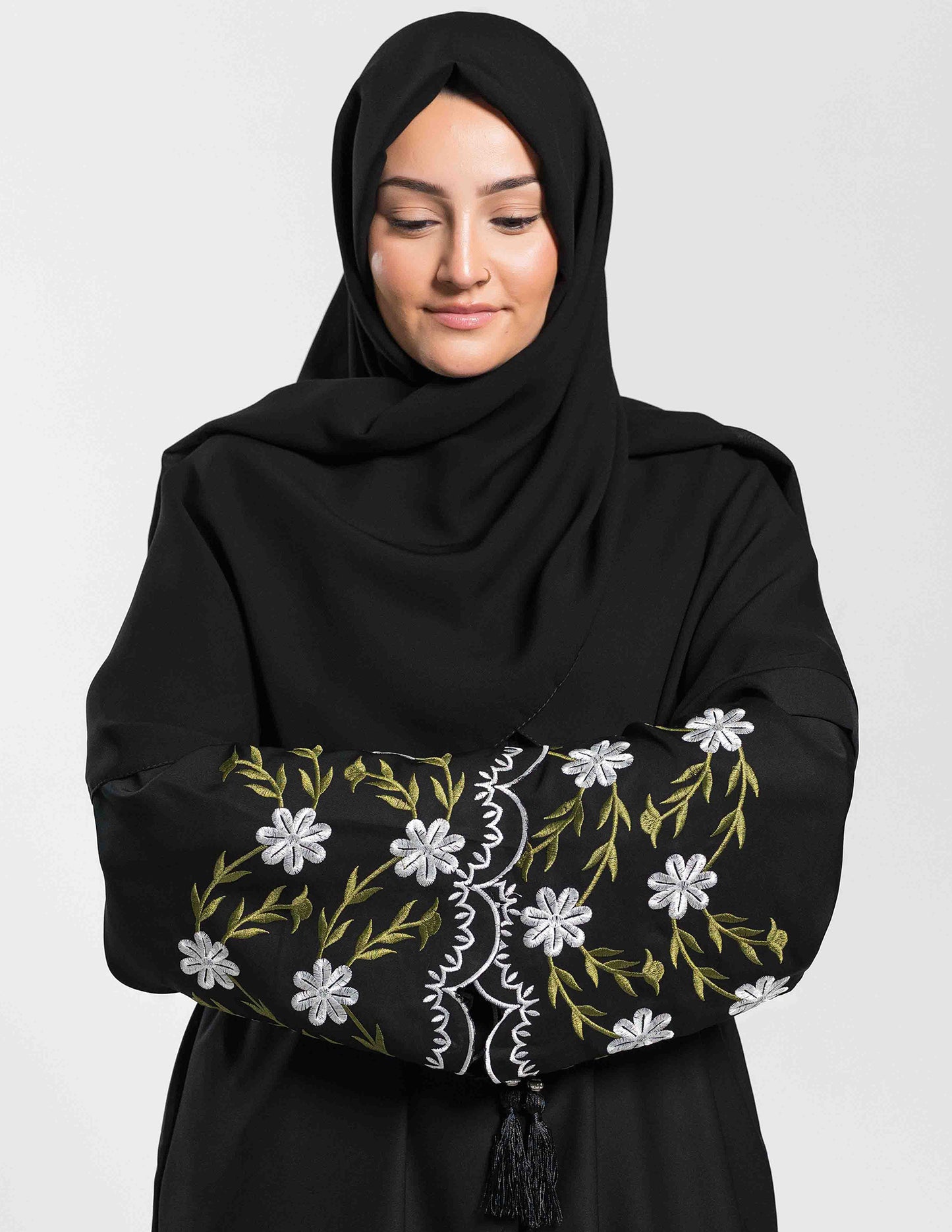 Regular price £51.00Beautiful Nida open abaya with pockets. Showcasing elegant green and white hand-embroidery across the sleeves and around the bottom border of the abaya, offering a real regal look fit for a queen.