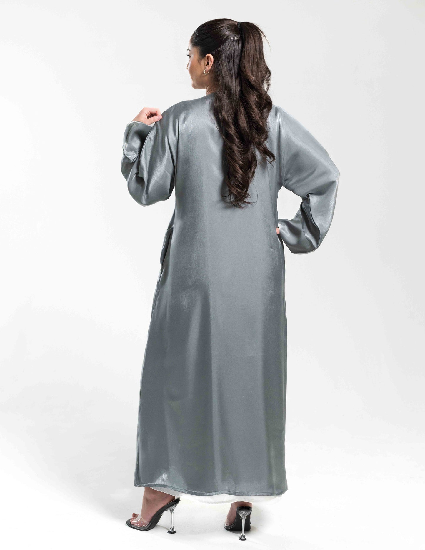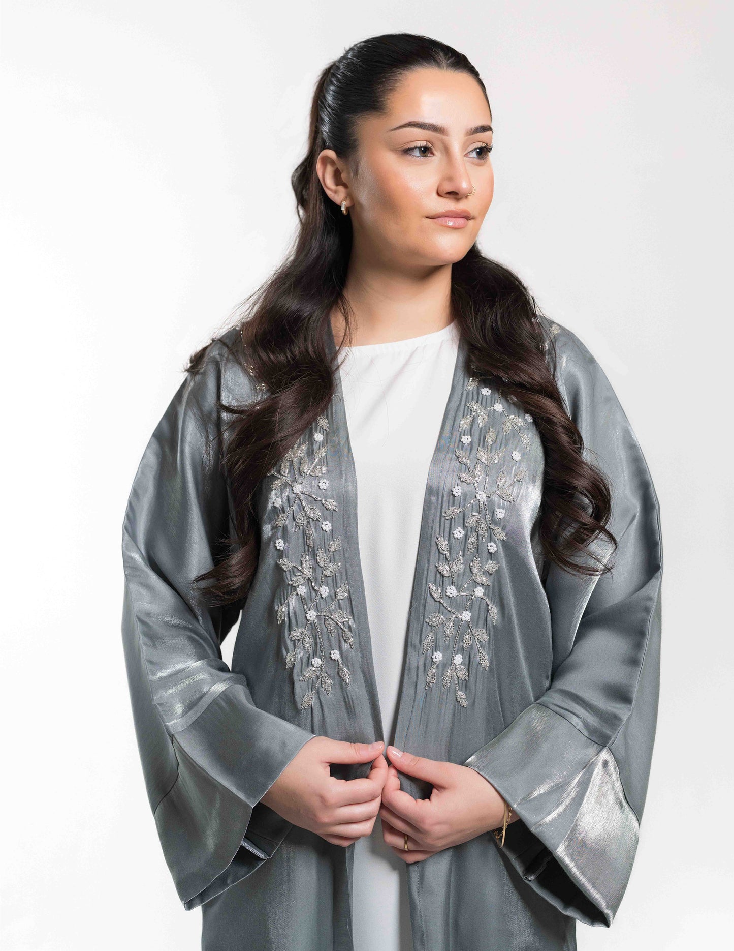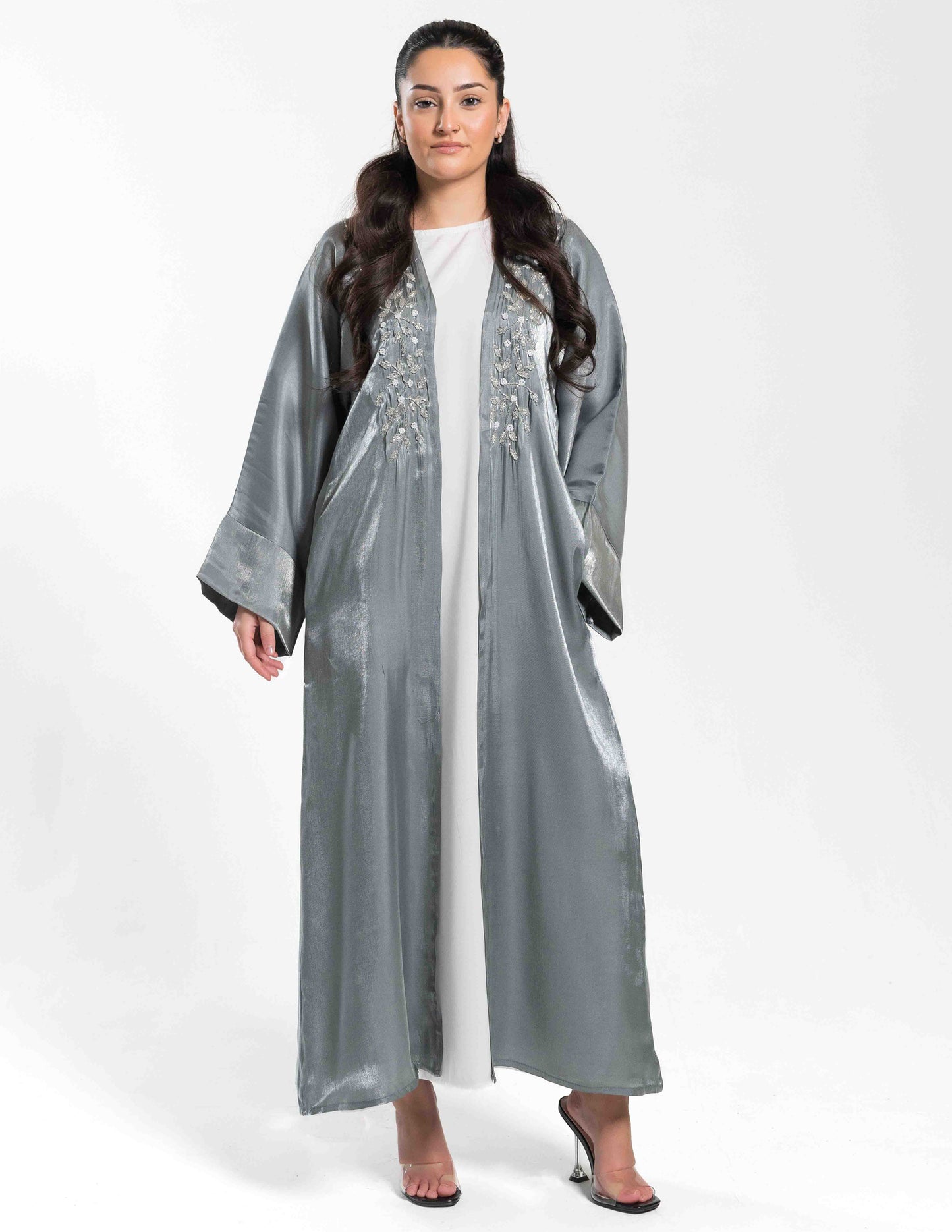Regular price £51.00Gorgeous open steel grey abaya in a soft touch organza fabric, with exquisite embellishment around the neckline. Complete with a white slip dress, and a matching hijab & belt.
