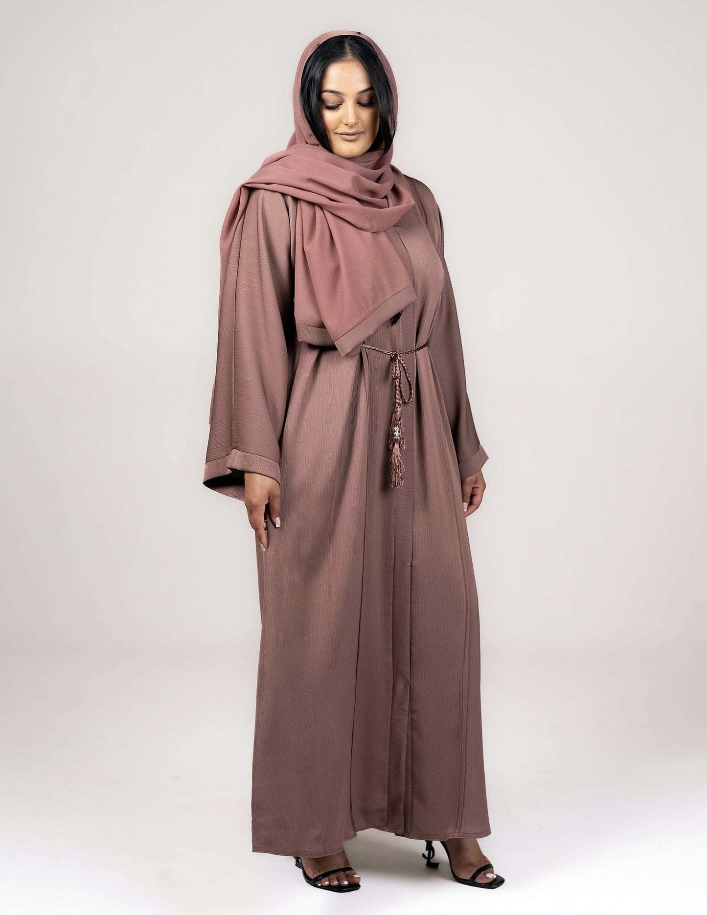 A classic wardrobe staple now in a brand new colour, the buttoned open abaya with a subtle pleat design in a soft touch and lightweight chiffon and zoom blend. Comes complete with a matching hijab.