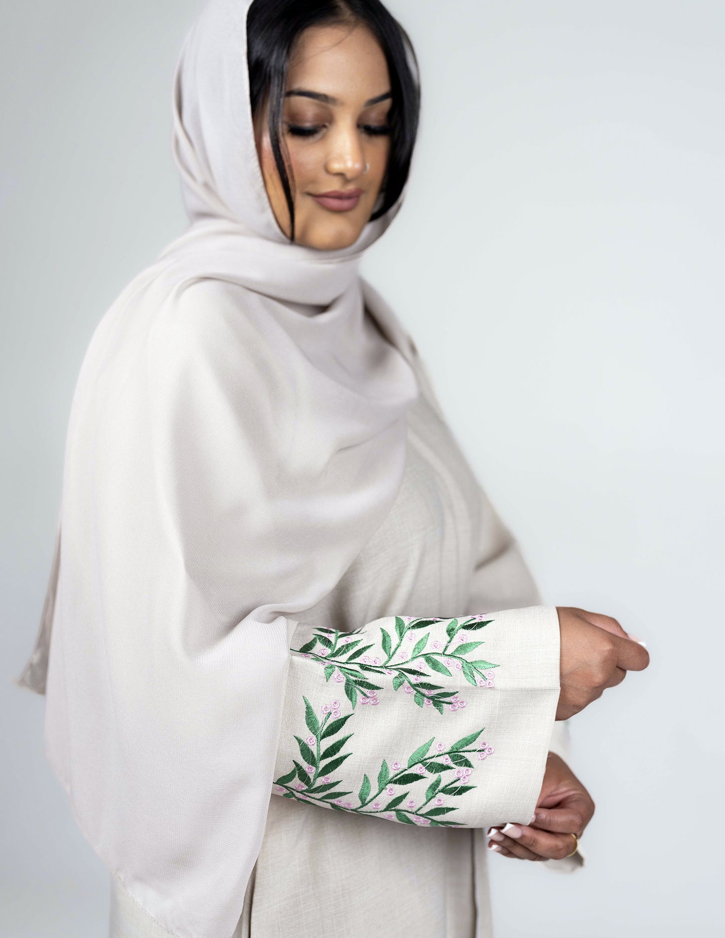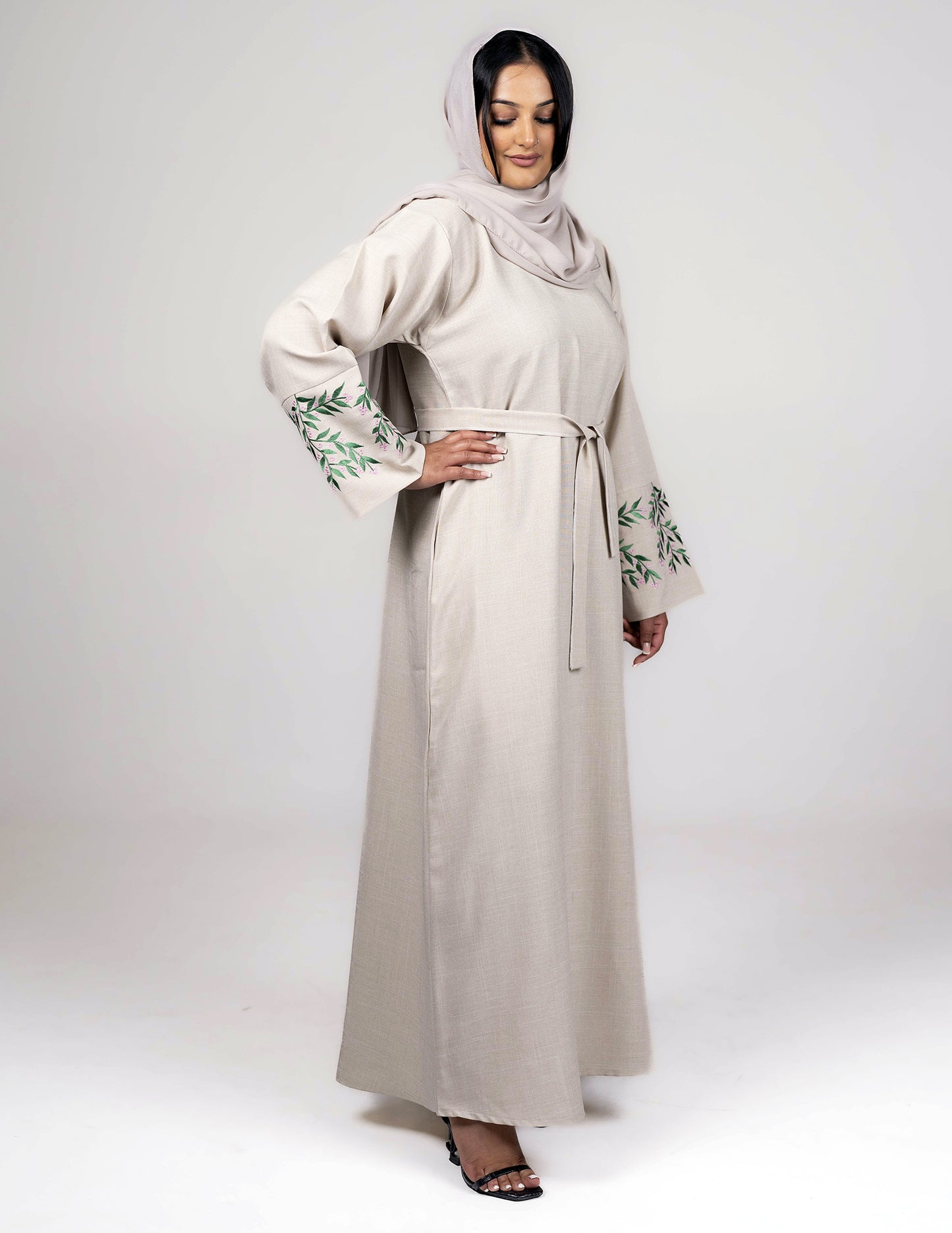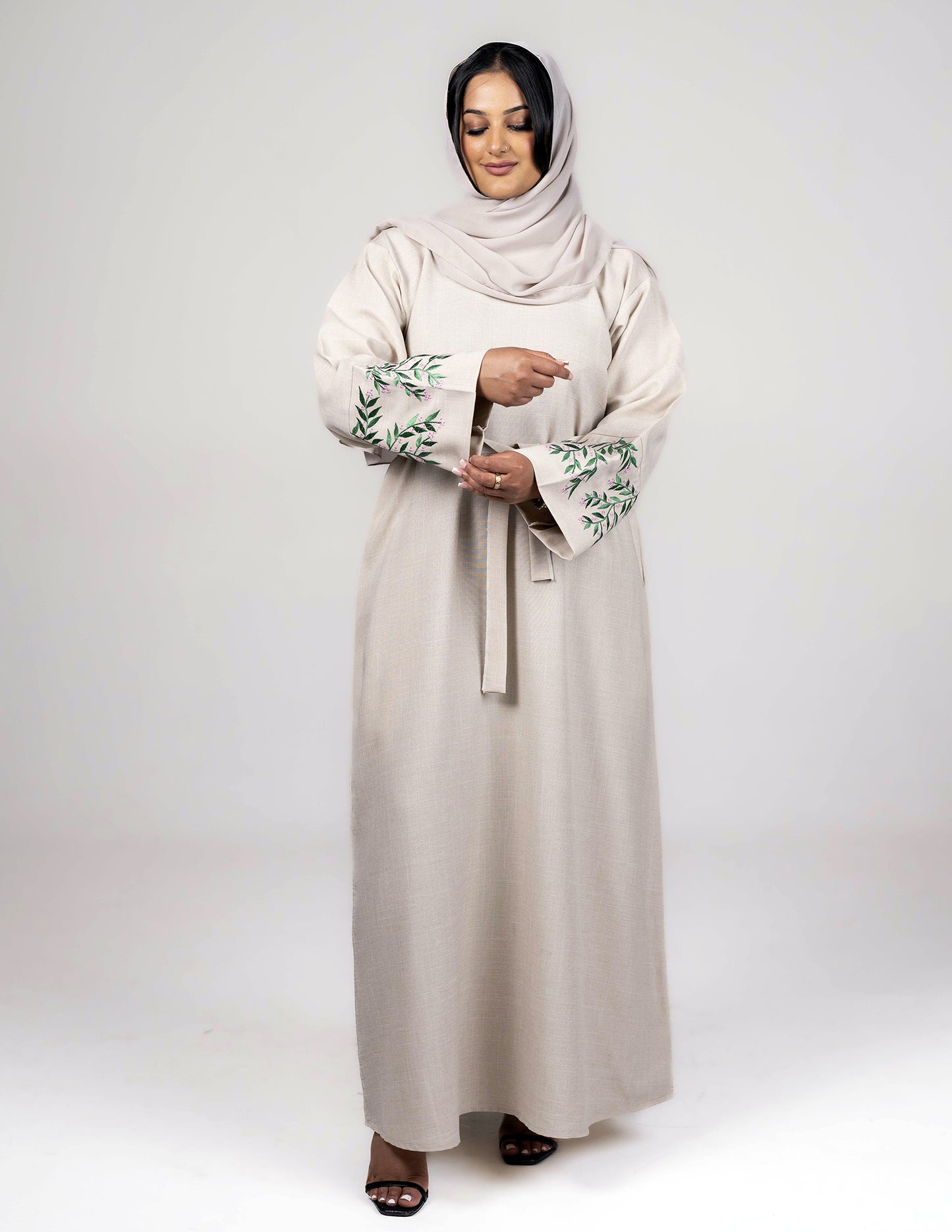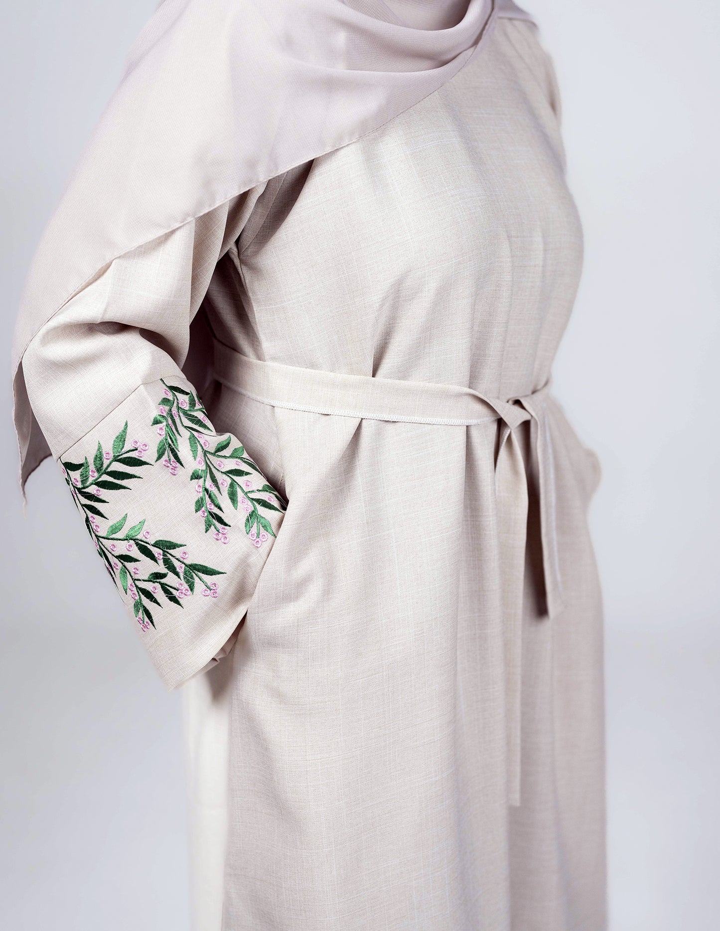 Beige Linen 'Samar' Abaya with Sleeve Embroidery