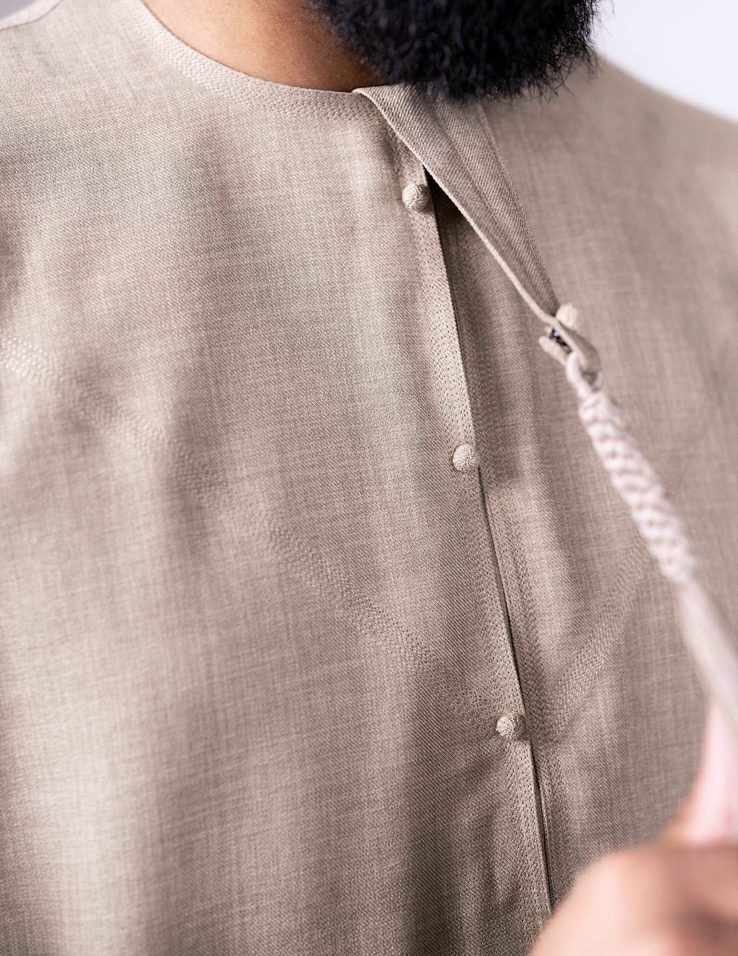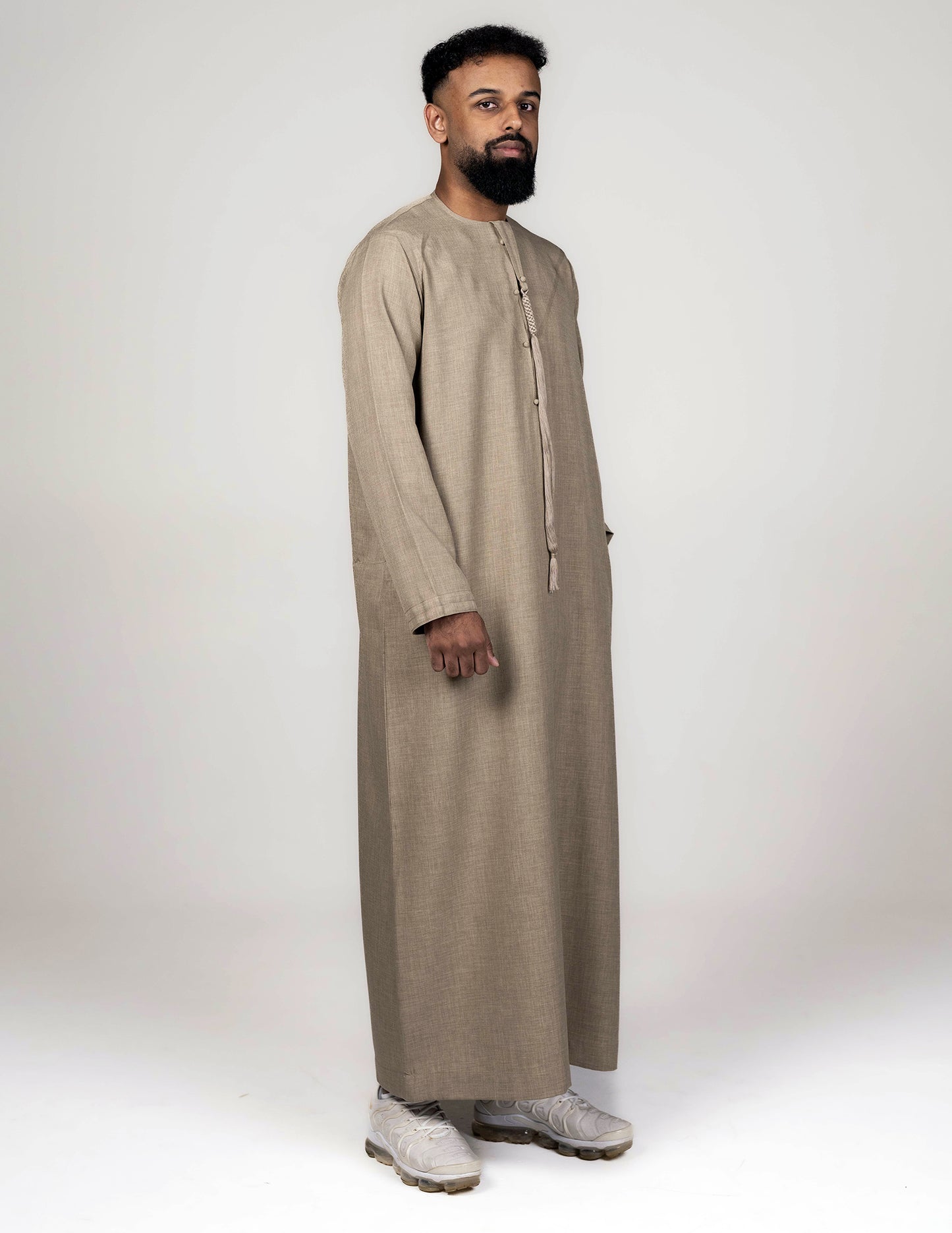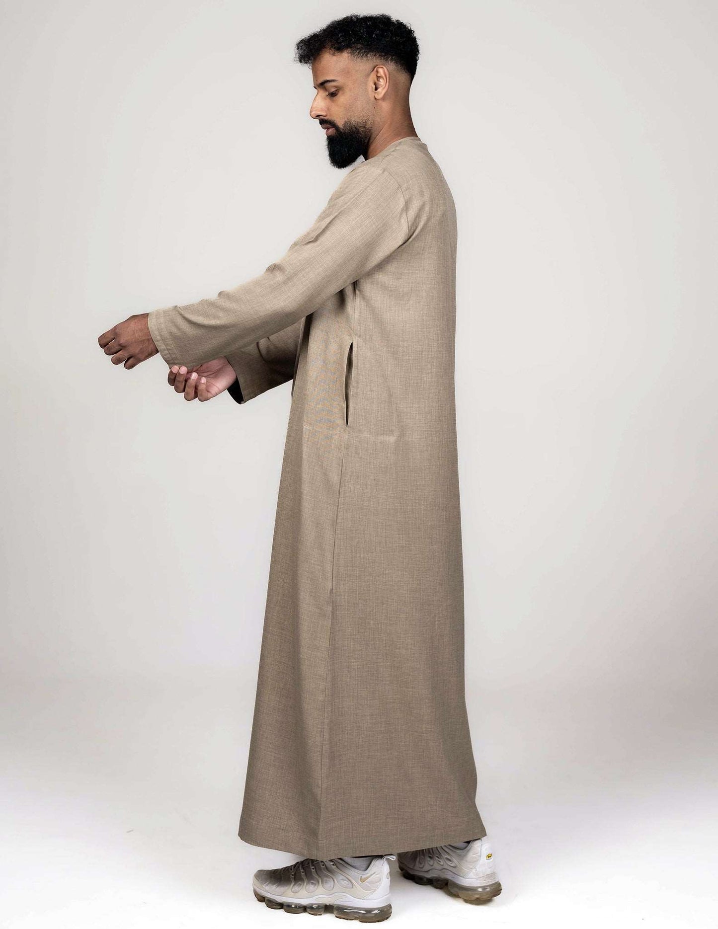 Beige Men's Emirati thobe in a High grade mélange twill fabric, not available on the average high street store for thobes. The mens range has been worth the wait, and is finally here crafted in a quality that is unparalleled. High quality craftsmanship on the stitching and the detailing enhances the premium grade twill fabric, providing true comfort, style and class.