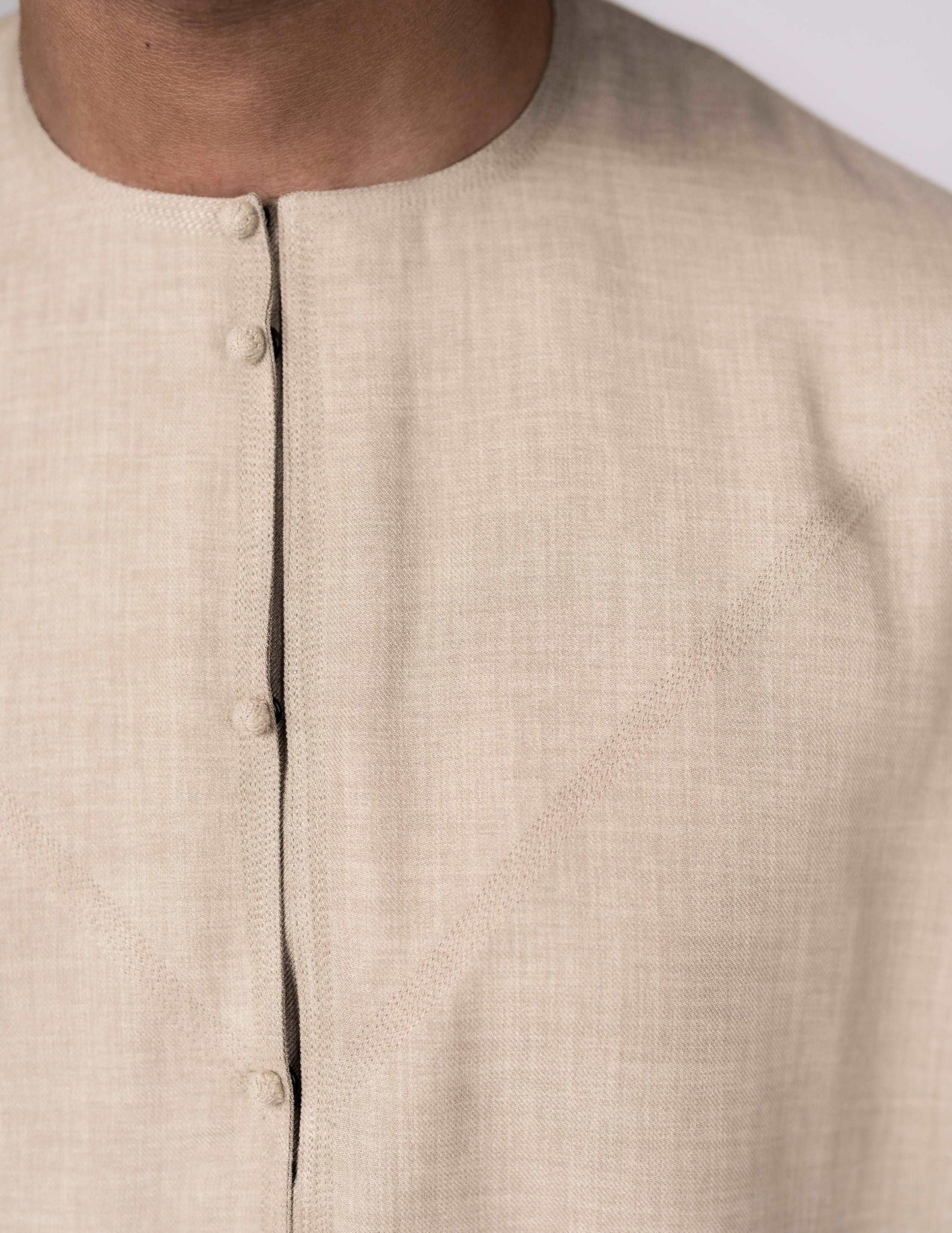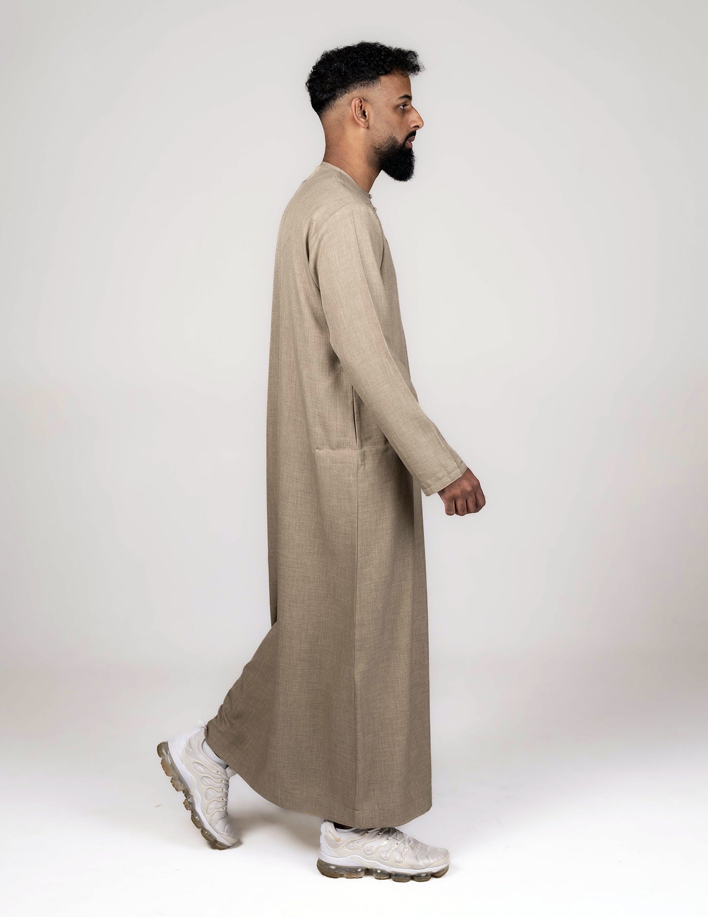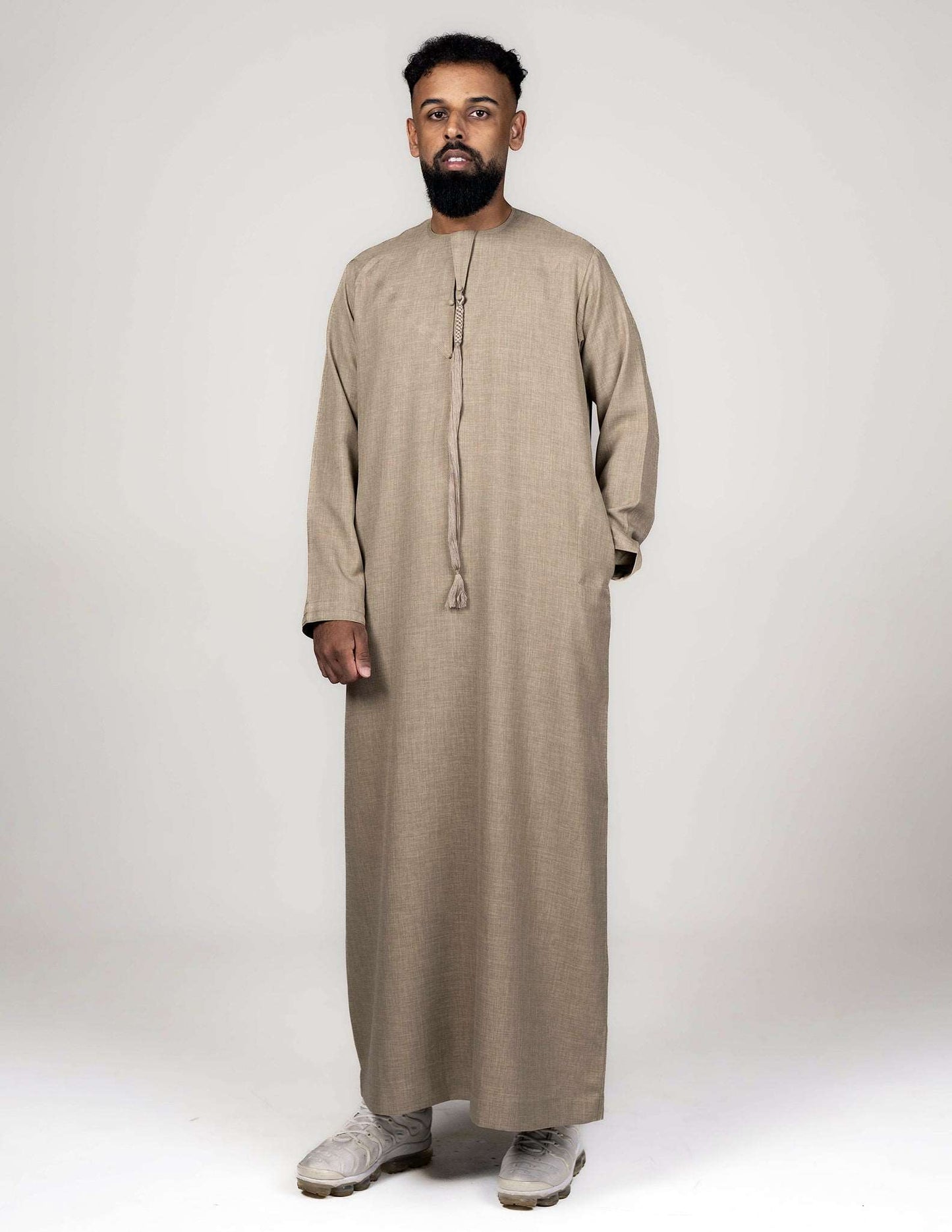 Beige Men's Emirati thobe in a High grade mélange twill fabric, not available on the average high street store for thobes. The mens range has been worth the wait, and is finally here crafted in a quality that is unparalleled. High quality craftsmanship on the stitching and the detailing enhances the premium grade twill fabric, providing true comfort, style and class.