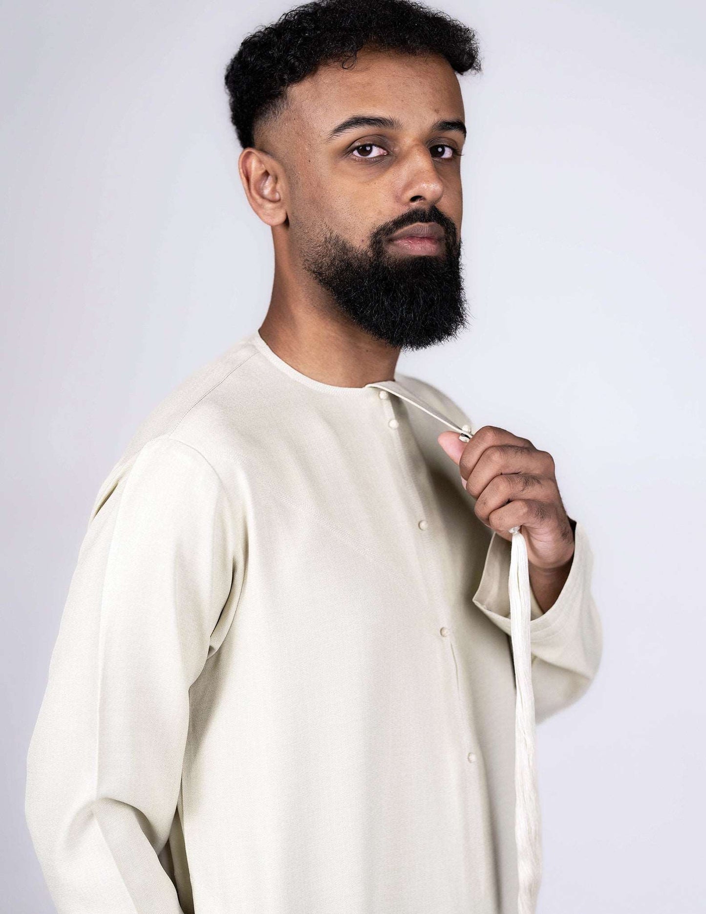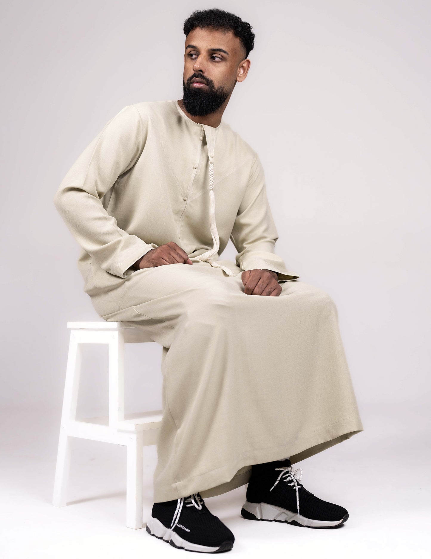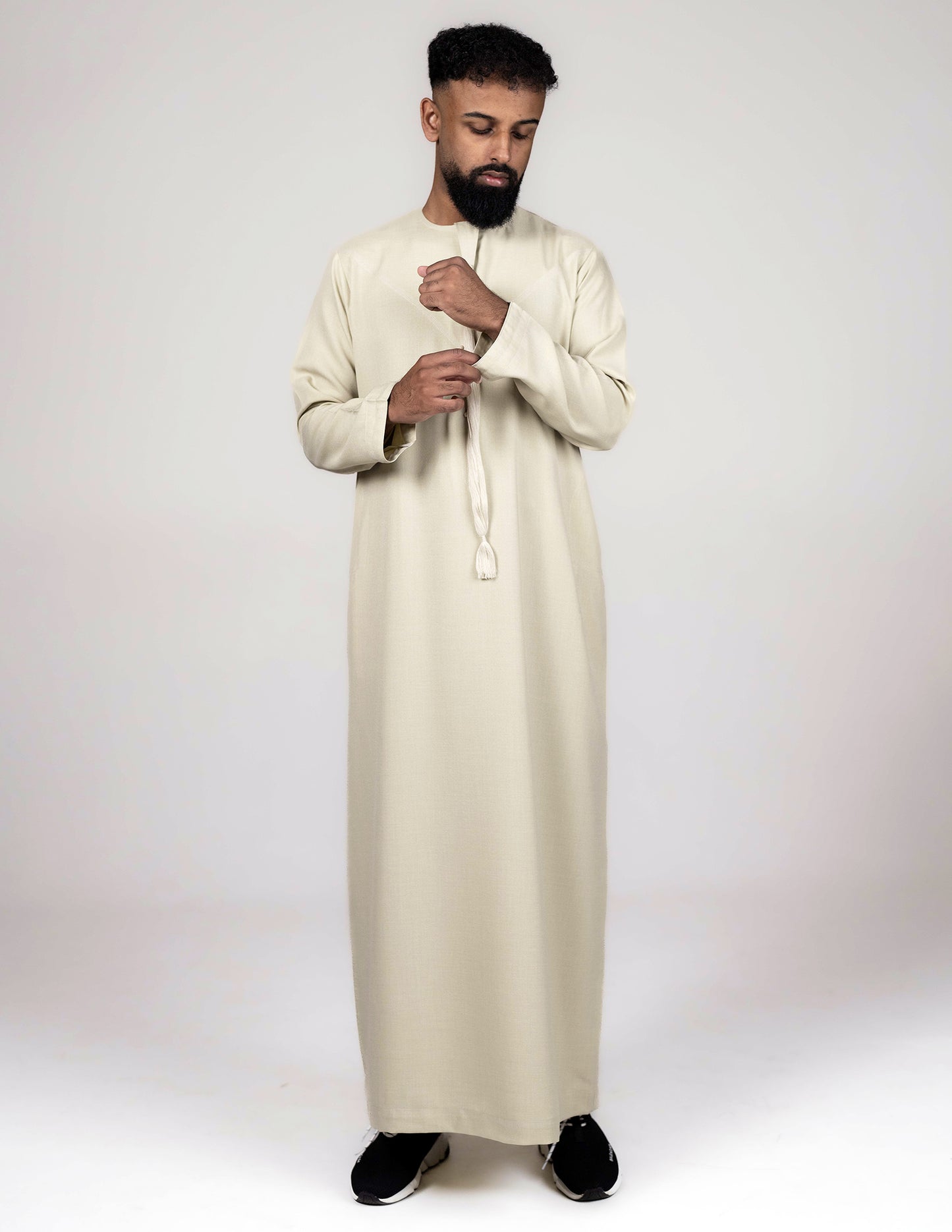 Cream Emirati thobe in a High grade mélange twill fabric, not available on the average high street store for thobes. The mens range has been worth the wait, and is finally here crafted in a quality that is unparalleled. High quality craftsmanship on the stitching and the detailing enhances the premium grade twill fabric, providing true comfort, style and class.