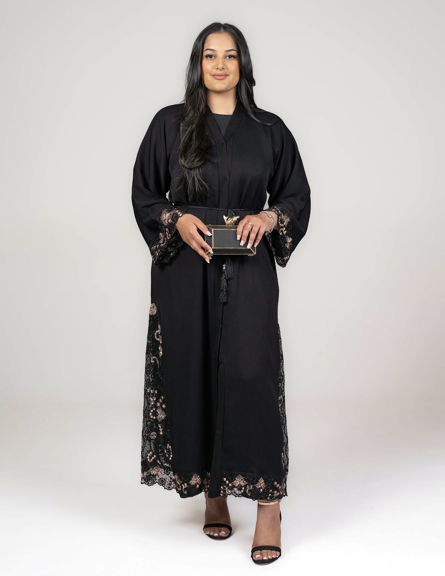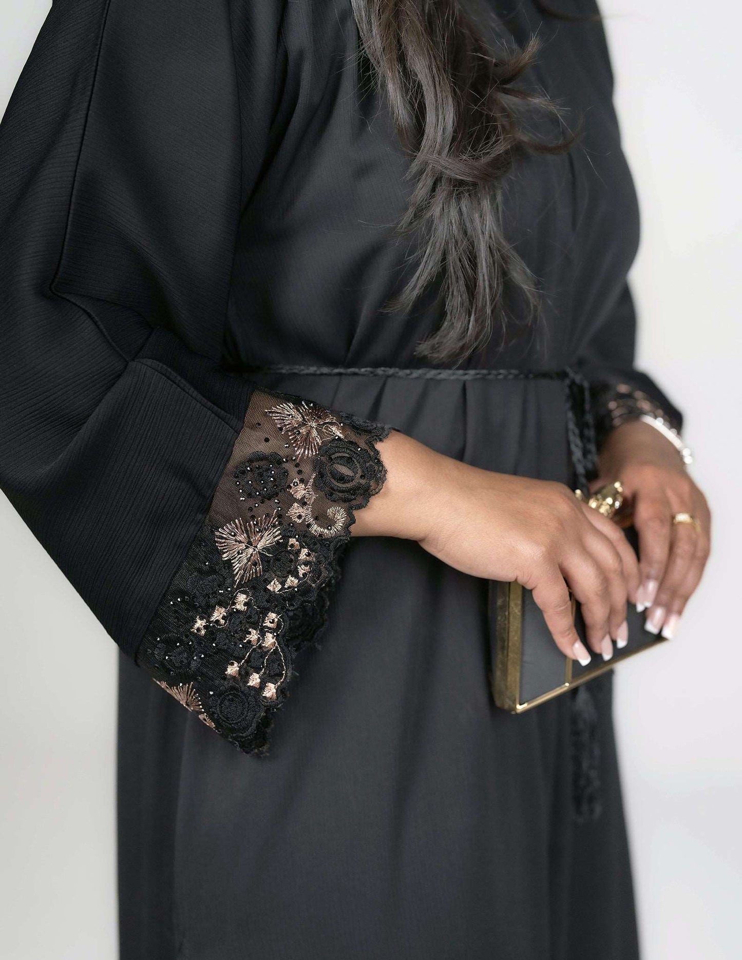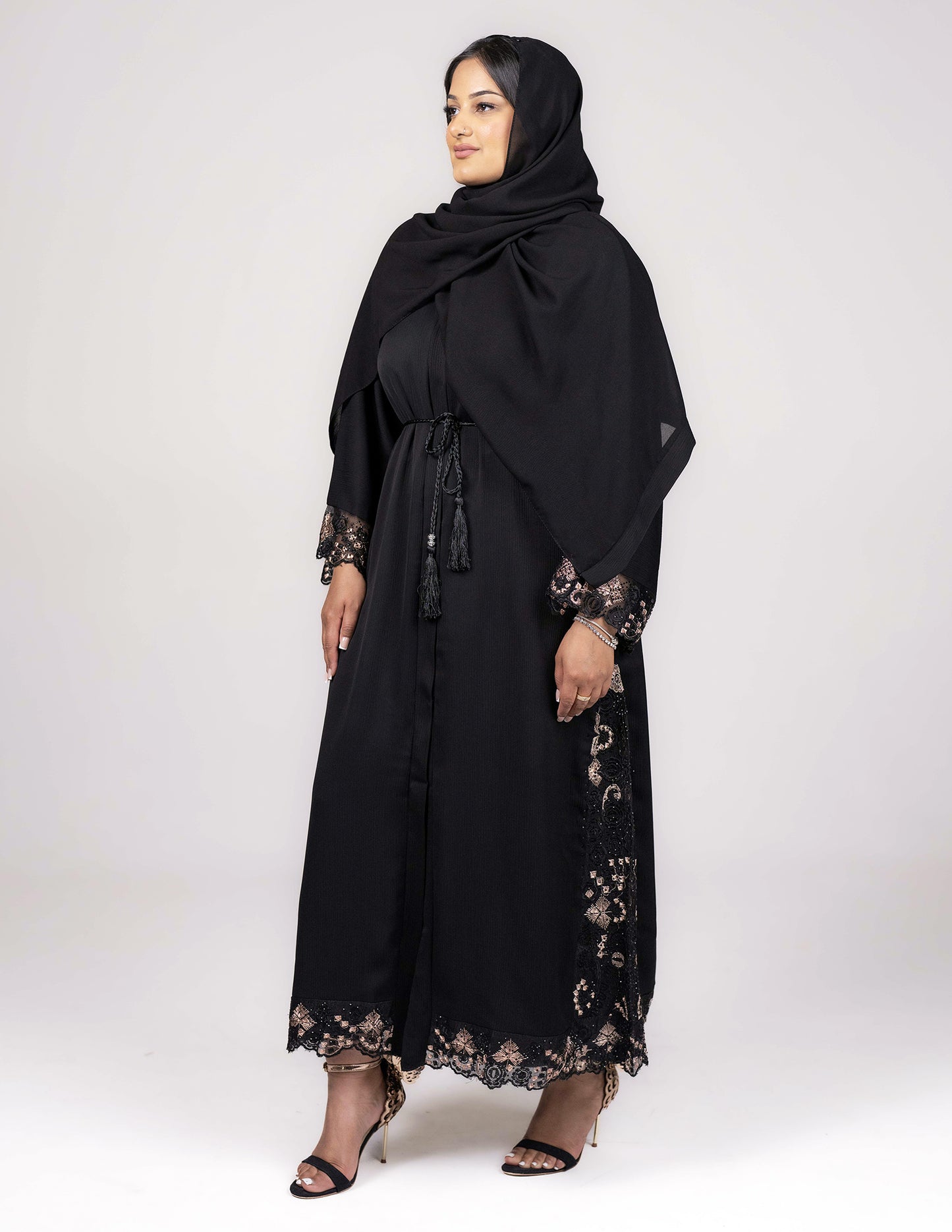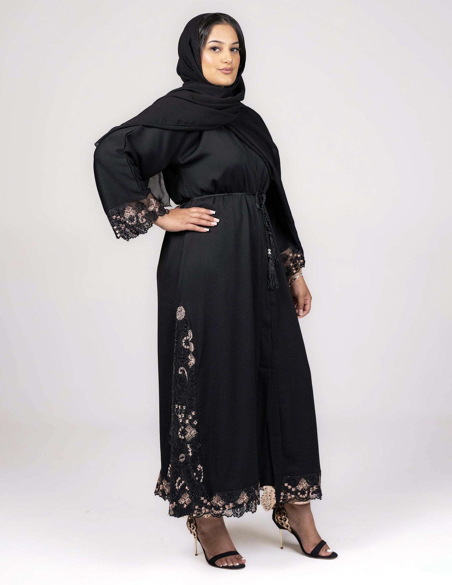Perfect for semi-formal or formal occasions, this exquisite abaya boasts of fantastic details intricately carved on lace sewn across the sleeves and the sides and bottom of the abaya, in a mix of black and soft gold colour embroidery on the lace. The abaya comes with a matching belt and hijab.