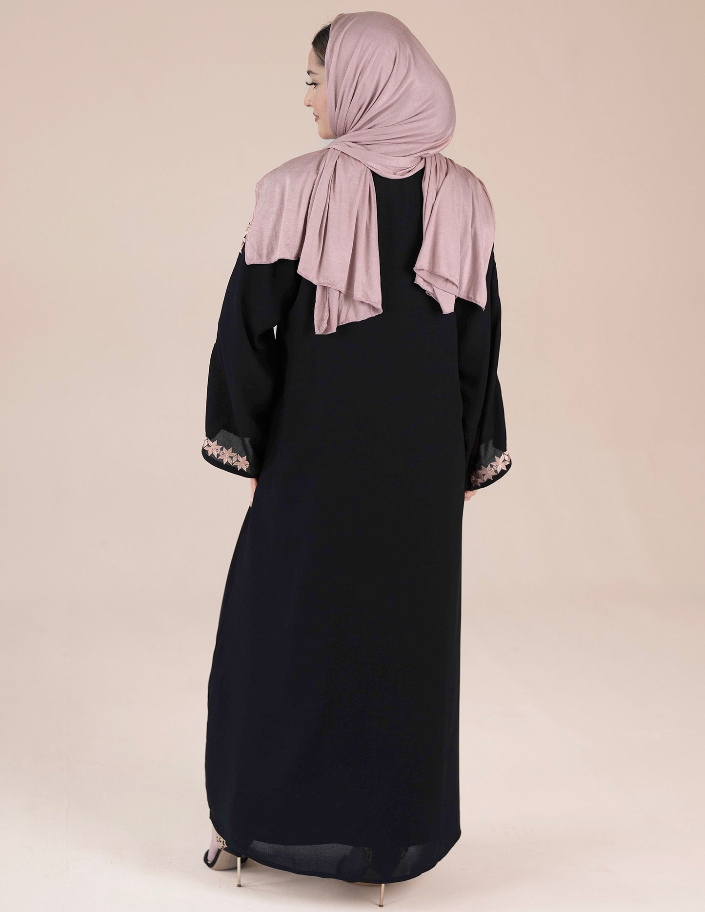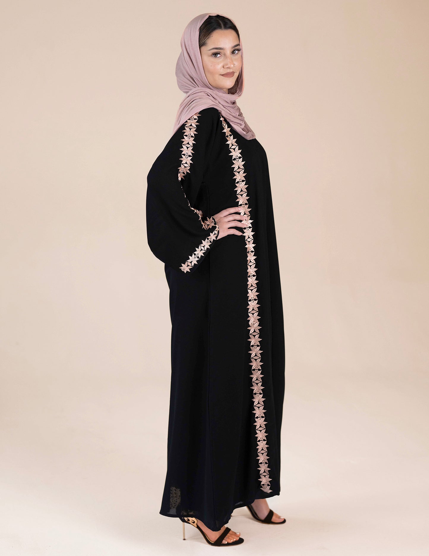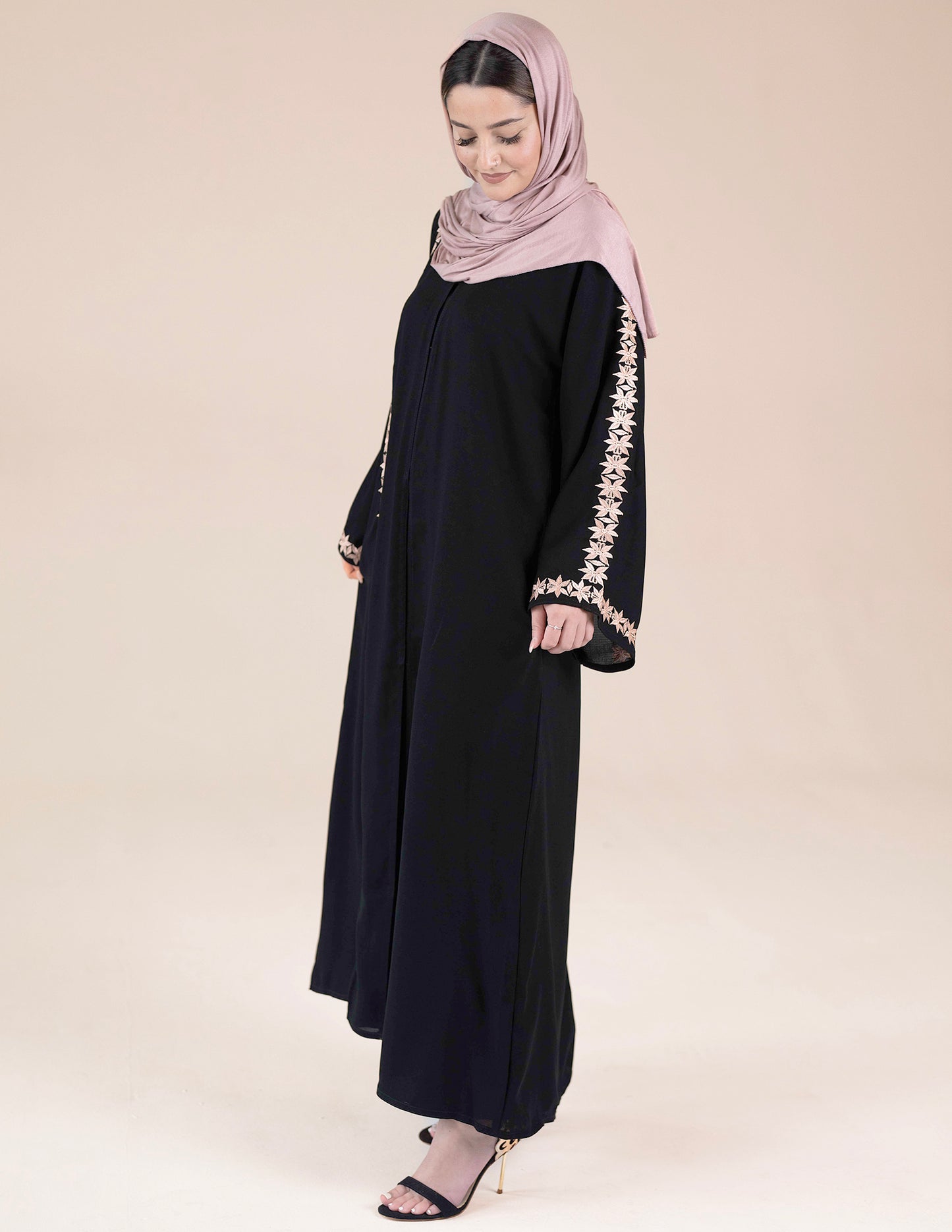 three piece buttoned abaya, with beautiful dusty pink embroidered detail along both sleeves and down the front on the right. The open black abaya comes with a matching belt and hijab. Please note: Model is wearing a premium dusty-pink jersey hijab for styling purposes, the matching hijab the abaya comes with is black.
