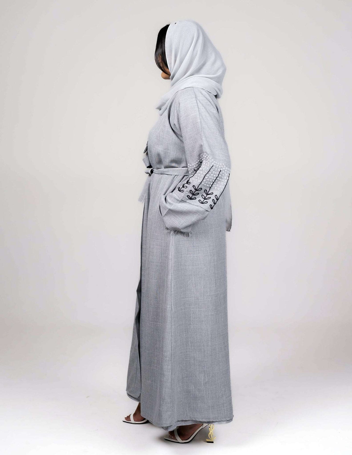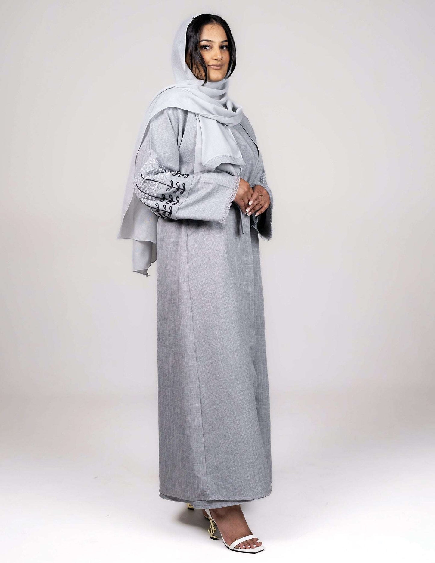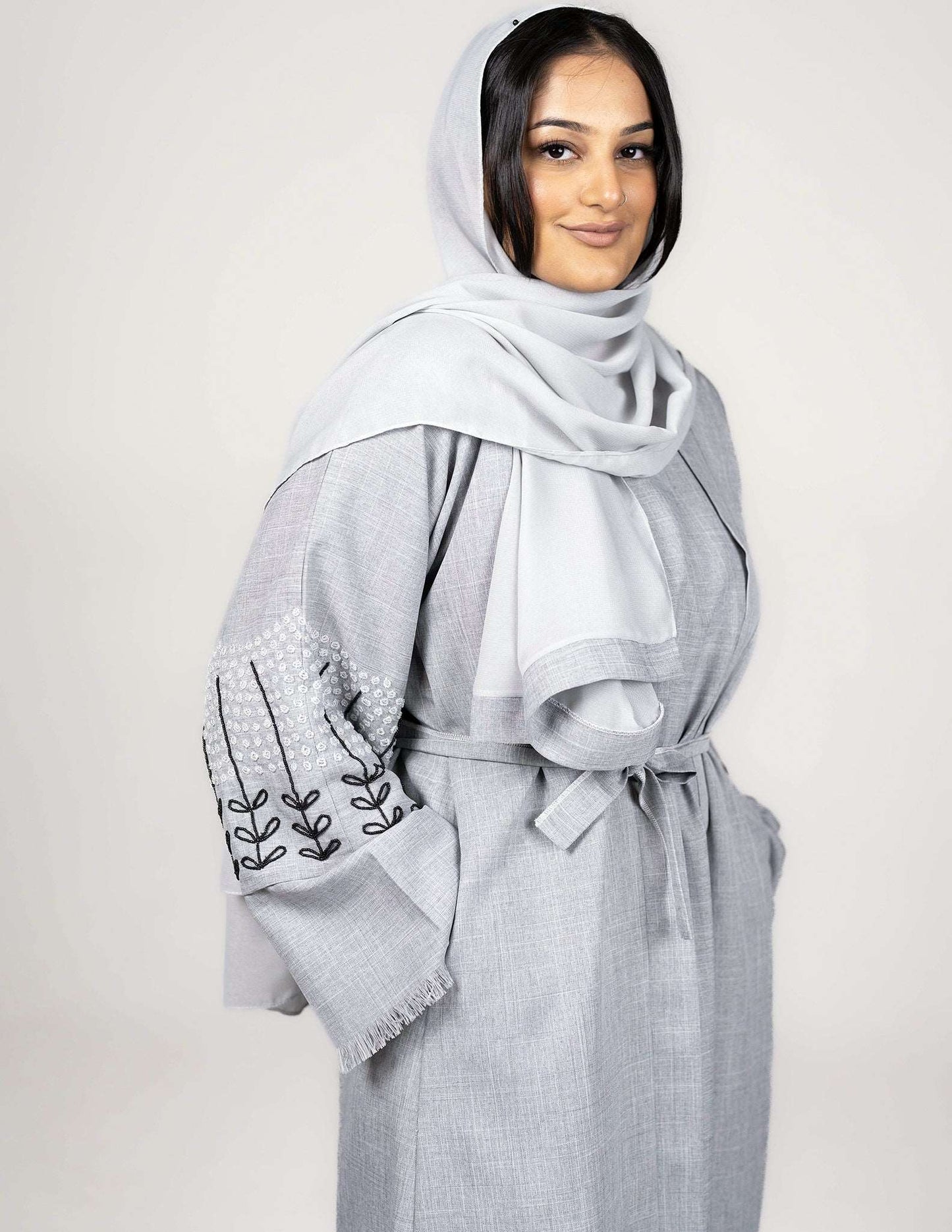 Grey Linen Open 'Ryma' Abaya with Sleeve Embroidery