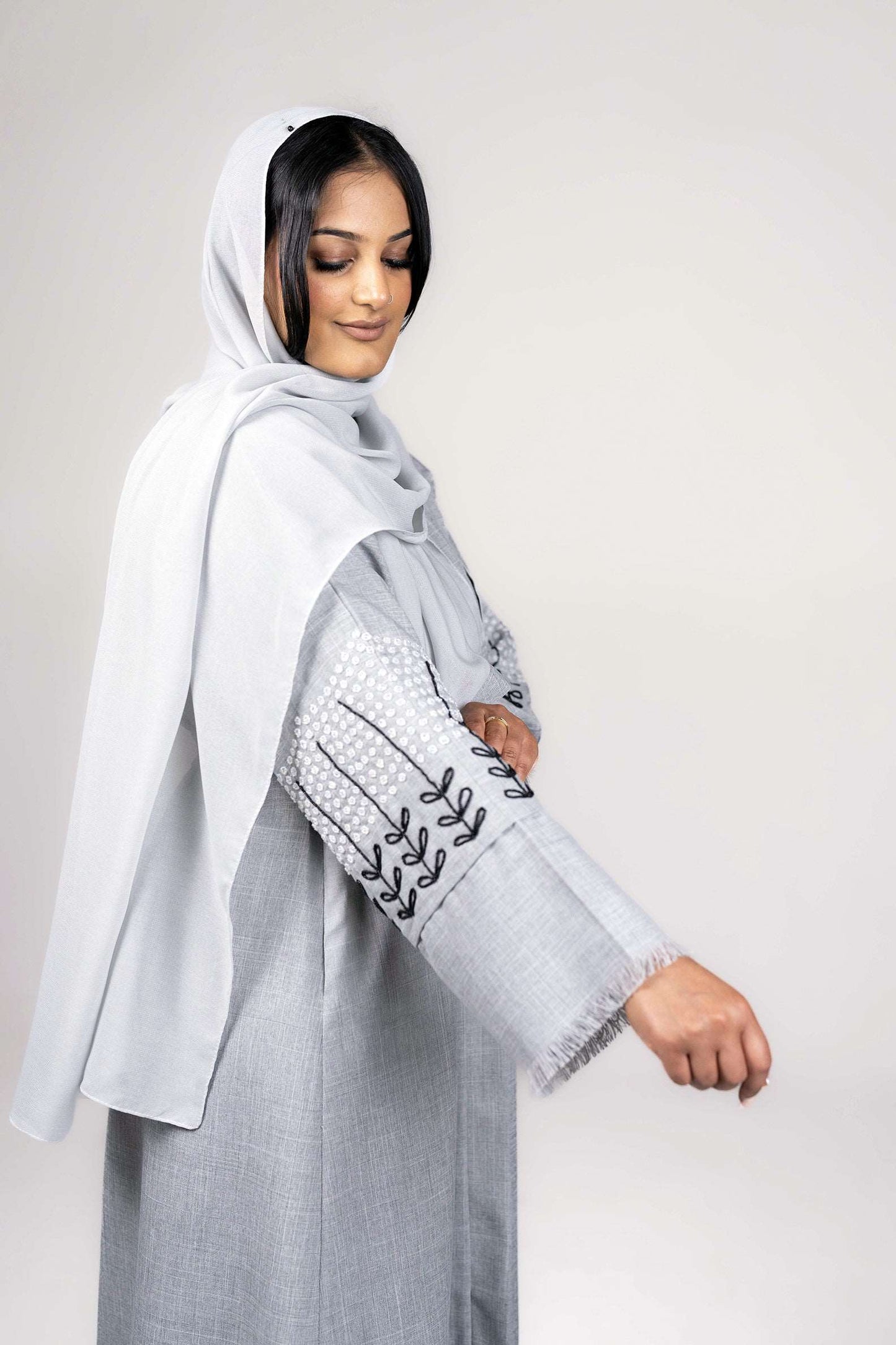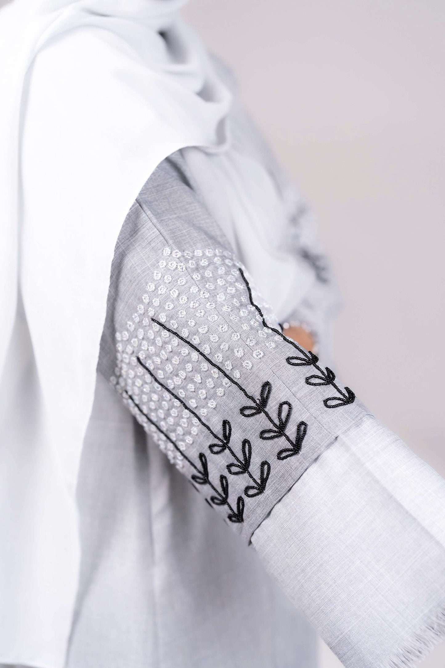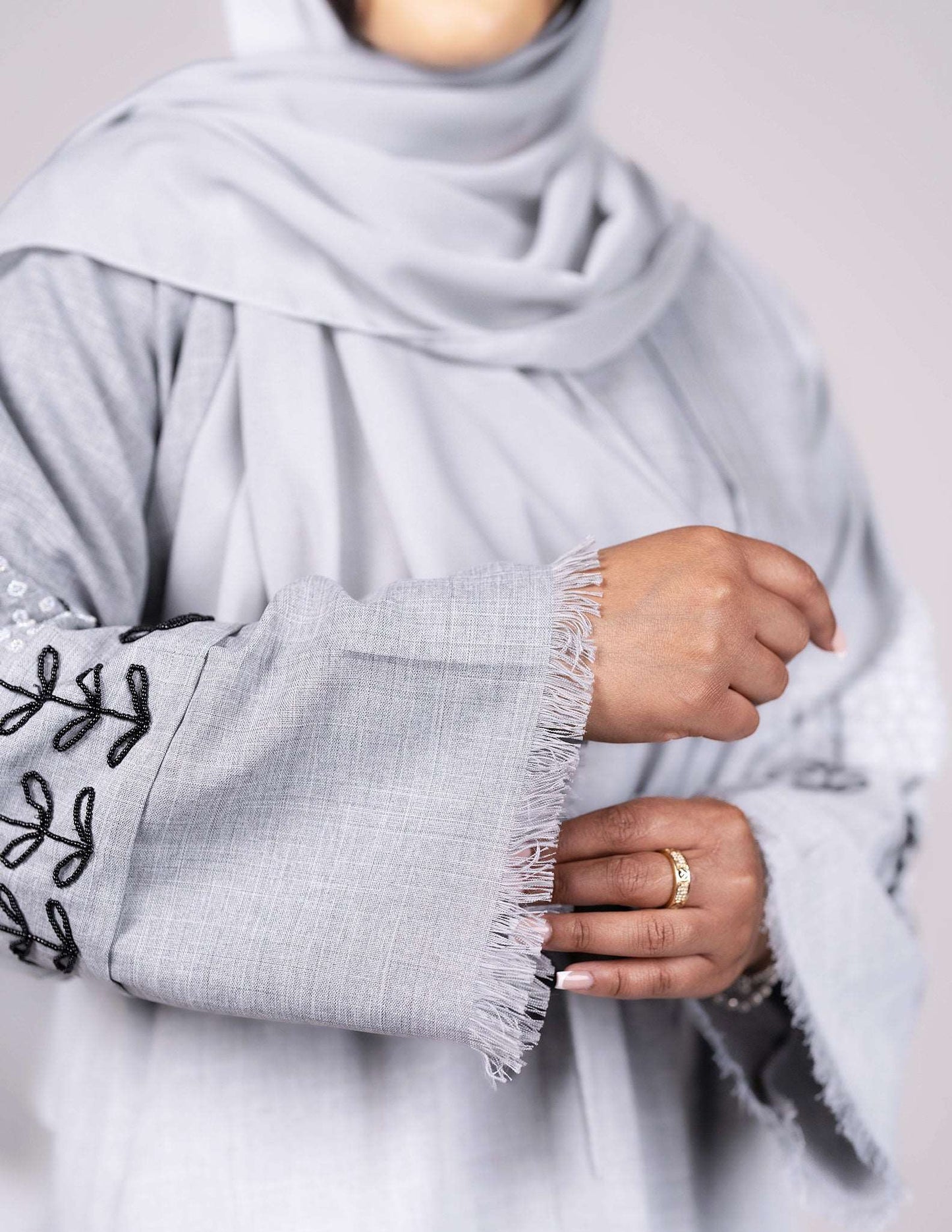 Grey Linen Open 'Ryma' Abaya with Sleeve Embroidery