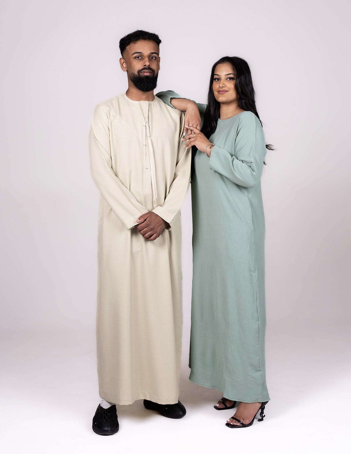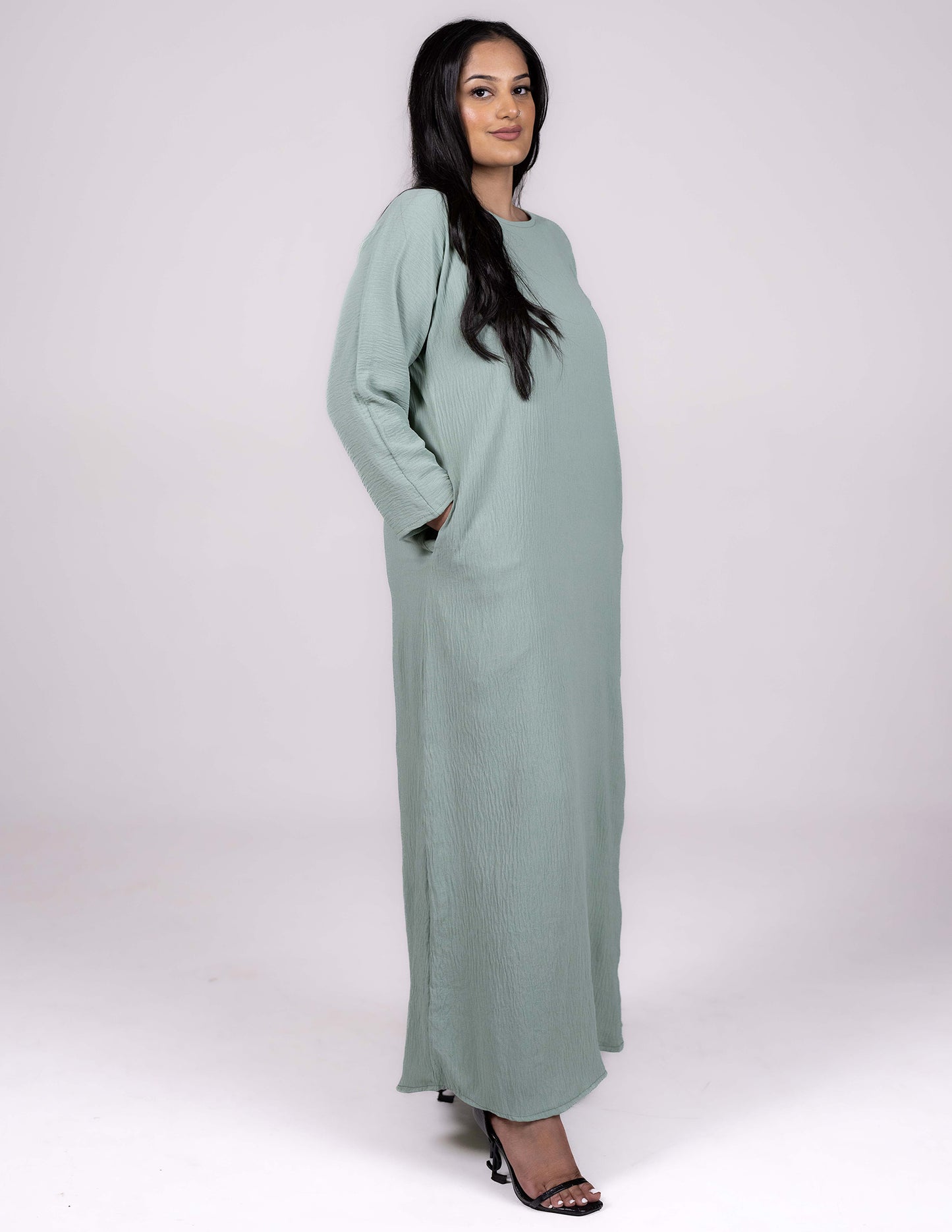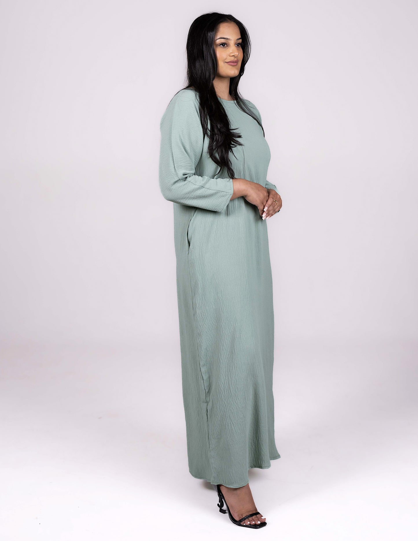 Cut in a modest style, this full length slip dress with pockets either side can be worn under any abaya outer or indeed as a standalone dress. Created in a high quality CY material (linen and polyester blend) giving a light touch, soft feel, and crepe like appearance up close with just enough flexibility to provide comfort and style alike. The dress is perfect for summer, and sure to be a great wardrobe staple.