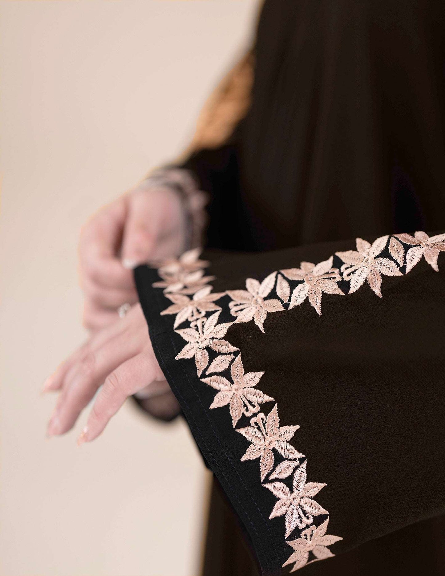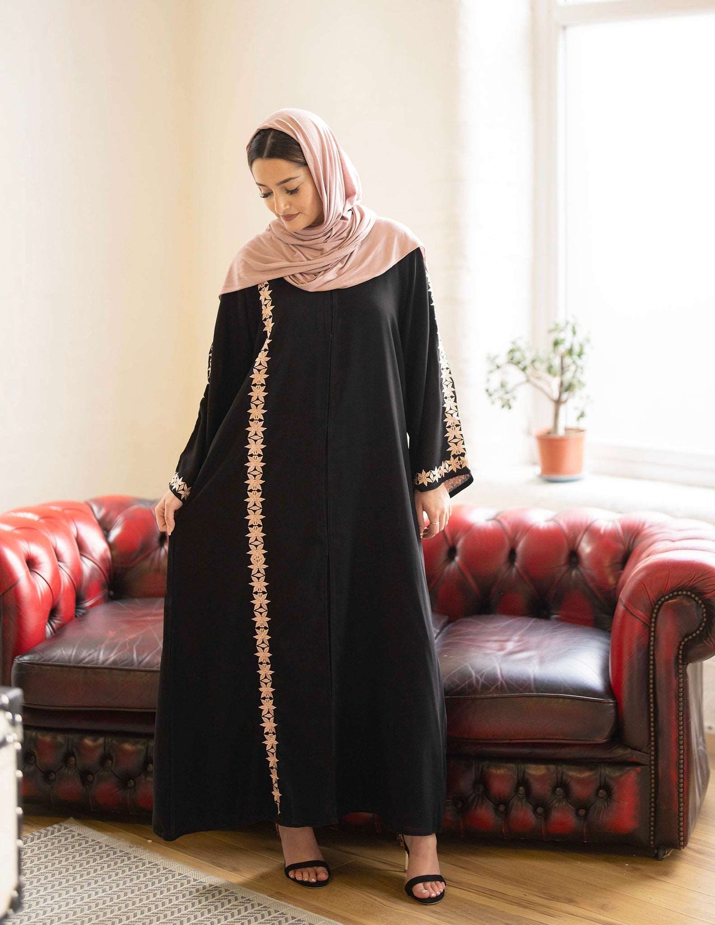 three piece buttoned abaya, with beautiful dusty pink embroidered detail along both sleeves and down the front on the right. The open black abaya comes with a matching belt and hijab. Please note: Model is wearing a premium dusty-pink jersey hijab for styling purposes, the matching hijab the abaya comes with is black.